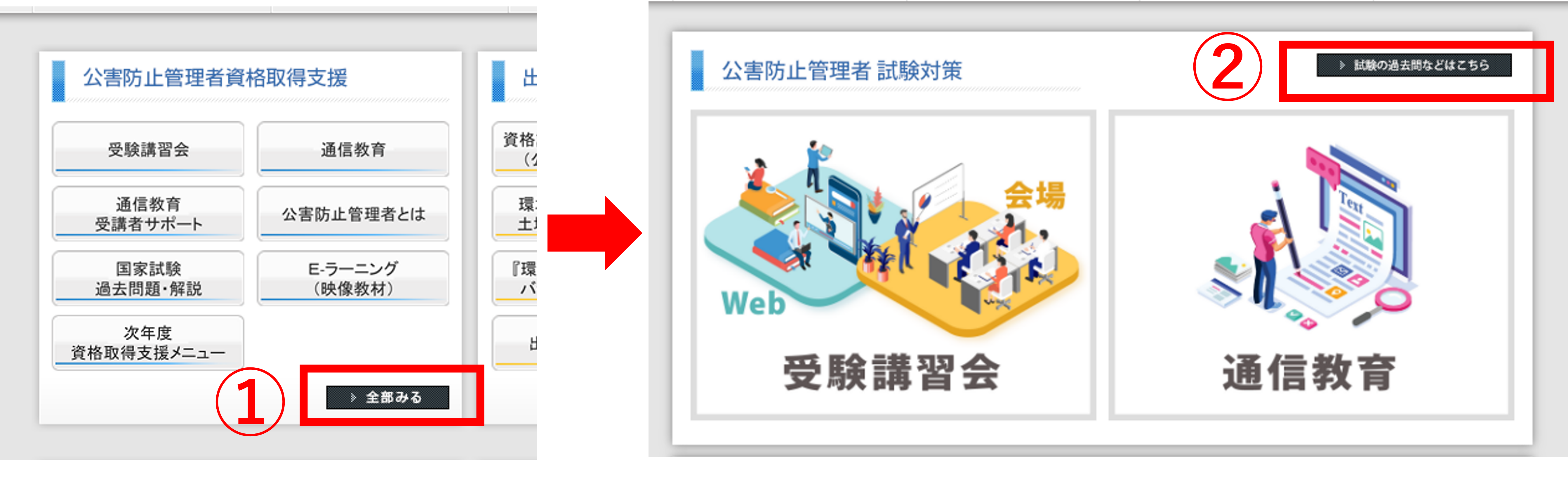 旧サイトにありました各カテゴリーの左図①「全部みるボタン」は、新サイトでも各カテゴリーの右図②に設置しております。